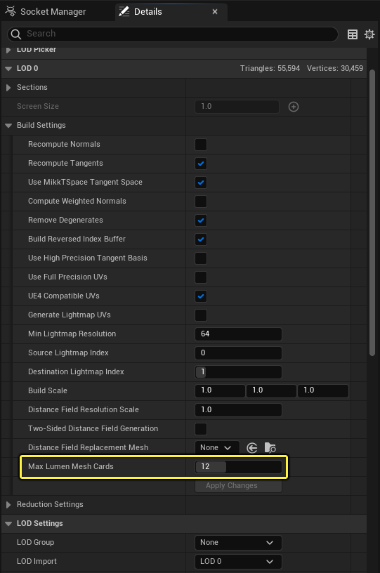 默认情况下,Lumen在一个网格体上放置12个卡,但可以通过在静态网格体编辑器的 构建设置(Build Settings) 中设置 最大Lumen网格体卡片数量(Max Lumen Mesh Cards) 来增加该数量。调整卡的数量对于更复杂的内部或具有不规则形状的单个网格体非常有用。